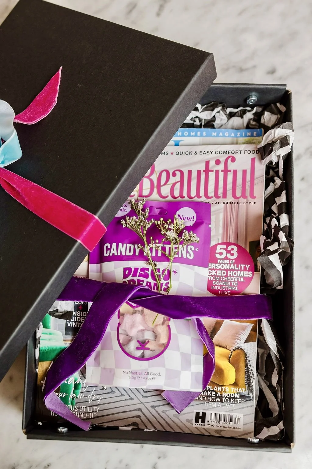 Every gift is presented in a stunning, beautifully wrapped design box, filled with interior magazines for inspiration and a selection of yummy treats.